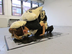 muslin, elastic, suction cups, acrylic paint, clip, plexiglass
